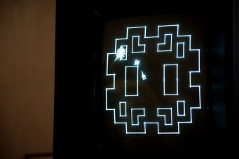 La Vectrex pour ceux qui ne suivent pas est une légende. Imaginez un oscilloscope (celui là même avec lequel vous vous amusiez à faire des vagues rigolotes en cours de physique, petit monstre inadapté au système) et une manette. L’oscilloscope n’est pas au format 4/3 oh non. Nous sommes en 1981, donc l’image est comme on la sent, et dans le cas présent on la sent bien : une sorte de 16/9 vertical. L’image est bien entendue en noir et blanc, mais va encore plus loin dans l’étrangeté en proposant au joueur en polo jaune fluo a col relevé qui ne connait pas encore Desireless et Voyage Voyage de jouer sur des images en vectoriel. Cela signifie concrètement qu’ici point de pixel, mais des coordonnées de points qu’un trait reliera. Cela donne une image d’une finesse incroyable et une fluidité assez folle. Ajoutez à cela un stick analogique de malade, des boutons rustiques, et vogue jeunesse.