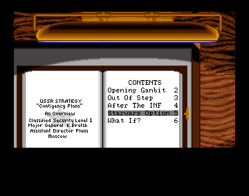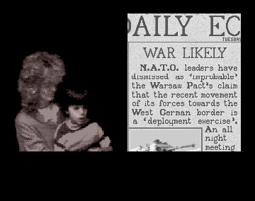 Bref. Vous avez envie de tout faire péter, et ce jeu va vous en donner l'occasion. C'est parti. Tout commence par une intro sobre, en noir et blanc, où l'on voit les gros titres pessimistes d'un journal défiler à côté d'une mère et de son gosse qui se demandent à quelle sauce ils vont être vitrifiés. Notez qu'on reconnaît bien là le jeu des années 80 : la mère en question a une choucroute infâme sur la tête, et le gosse une coupe au bol, la même que sur vos photos de classe de maternelle. Soit, ça ne donne que plus envie de transformer l'Europe en une immense banlieue de Saint-Étienne. On choisit son camp entre l'Est ou l'Ouest, non la Suisse n'est pas jouable n'insistez pas, et on lance un des cinq scénarios disponibles, qui vont de « Escarmouche frontalière » à « Dédé conduit son 15 Mégatonnes sur les autoroutes allemandes ».