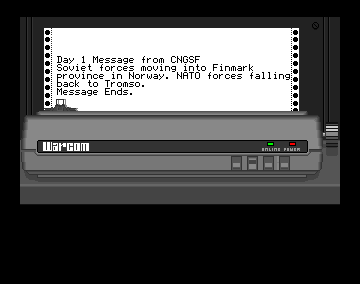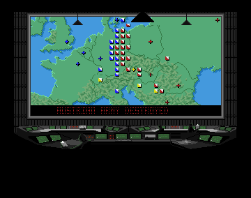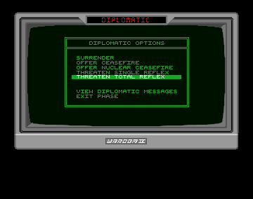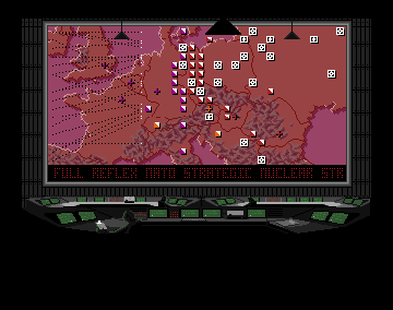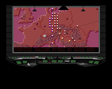 On ouvre donc la console de lancement. Le feu nucléaire s'utilise de la façon suivante : il faut taper des codes, qui se trouvent dans le manuel du jeu (oui, pas de chance si vous avez une copie pirate, ce qui était le cas d'à peu près la totalité des joueurs Amiga de l'époque), et qui ont tous un effet différent : détruire une ville pour diminuer les renforts de l'ennemi, un aéroport pour l'empêcher d'avoir la supériorité aérienne (qui détermine qui commence à jouer à chaque tour), un silo de missiles pour l'empêcher de vous rendre la pareille, etc. Les codes sont très, euh, parlant : par exemple, Dirty Harry ou July 14 pour l'Otan, Iron Curtain et Red Star pour les popovs. « Fumble Winter » et « Fire Storm » sont à utiliser uniquement si vous vous retrouvez coincé sur une montagne des Pyrénées avec trois italiens et deux français comme seuls rescapés de l'armée alliée, puisqu'ils déclenchent une attaque globale, ce qui a pour effet de chambouler quelque peu le haut de la liste des formes de vies les plus évoluées, et concrètement, de produire un bel écran Game Over.