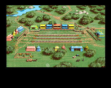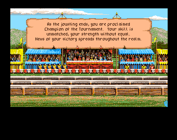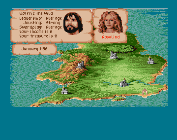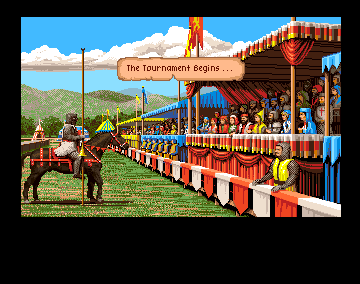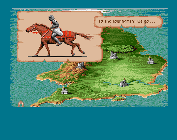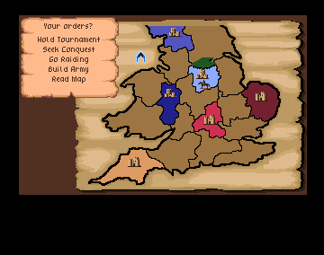 * Organiser un tournoi : parce que les chevaliers ne sont pas que des beaufs mal rasés qui n'aiment rien tant que violer une jeune pucelle sur la place du village après avoir cloué ses parents sur la porte de l'église en flammes : ce sont avant tout des gentlemen. On peut donc s'affronter, soit pour un territoire, soit pour la gloire. On a alors droit à une magnifique séquence en pseudo-3D vue à la première personne, où on galope vers l'ennemi en essayant tant bien que mal de viser le bouclier de l'adversaire avec sa lance (ou les côtes, mais ça c'est vache, surtout en ces temps reculés où les traitements contre le pneumothorax étaient relativement inexistants).