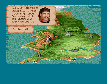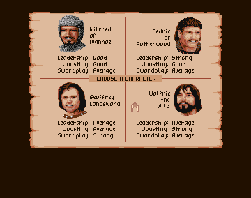 Et comme de bien entendu c'est au joueur qu'il revient de prendre en main un de ces petits couillus pour remettre de l'ordre. Juste après l'écran-titre (qui pue la classe anglaise, avec une petite musique genre « la vipère noire »), on doit choisir entre quatre têtes de vainqueur, qui diffèrent par leur capacité à commander, leur habileté à tricoter de l'épée, et leur aptitude à la joute. Personnellement je choisis toujours Cedric de Rotherwood, sa tronche me rappelle Magnum, le moule-quéquette en moins.