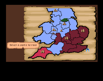 Une fois expédiées ces formalités administratives, on ne perd pas de temps en cérémonies inutiles de passation des pouvoirs, de prières interminables et de serments sur les Écritures, et on se retrouve direct face à une carte de l'Angleterre. Juste l'Angleterre hein, il ne s'agirait pas d'aller fricoter avec ces Scots qui se baladent en jupe, non mais oh. On dispose d'un petit territoire défendu par un château fort, et une armée, pour le moment peu fournie. Idem pour nos cinq opposants, saxons ou normands. Le jeu se déroule au tour par tour ; chaque mois, on peut choisir entre plusieurs actions :