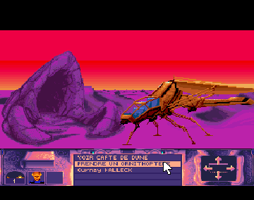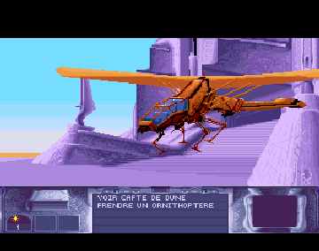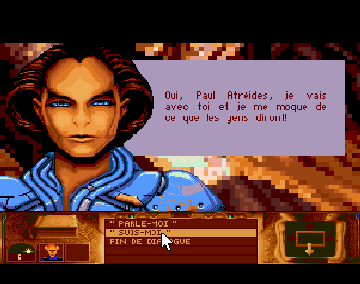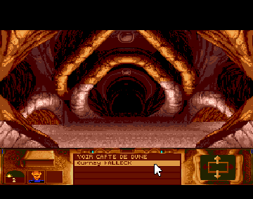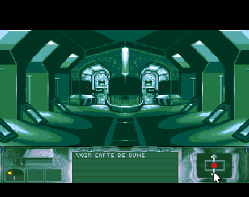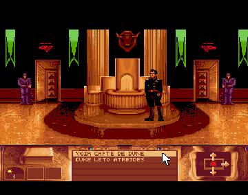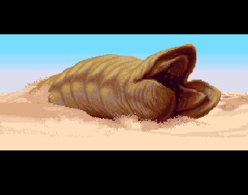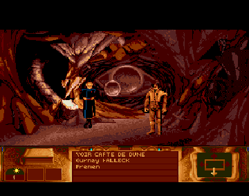 Mais tout ces beaux sentiments auraient pu rester lettres mortes s'ils n'allaient de paire avec des graphismes sans faille. Comme ici, ça tombe bien. Non pas que Dune soit un jeu éblouissant de par sa technique. L'intégralité se déroule sur des plans fixes, à part quelques séquences de voyage dans le désert qui font pâle figure face au Mode 7 de la Super Nes, et les animations des visages des persos qui se limitent aux mouvements des lèvres et des sourcils. Non, c'est plutôt du côté artistique que ça envoie du chêne massif. Cryo est parvenu à créer un style unique et « fort », tout en laissant à l'imaginaire des joueurs qui ont lu le livre la place qui lui est dûe, ce que n'avait pas réussi à faire le film (le jeu en reprend d'ailleurs peu d'éléments, à part la tronche de Paul et le design des distilles). Vous verrez, après avoir touché à ce jeu, vous visualiserez un ver géant jaillissant hors du sable quand on vous parlera de désertification, et le visage buriné de Kersauson vous fera penser à un Navigateur de la Guilde. Voilà, Dune, c'est ce genre de graphismes.