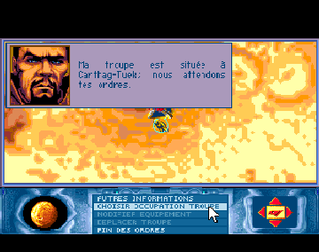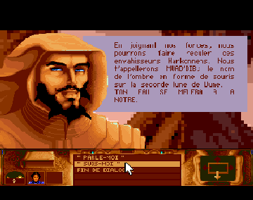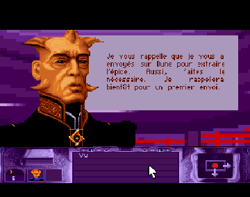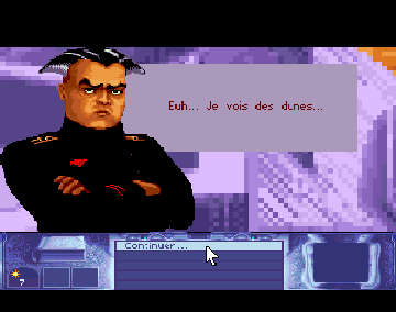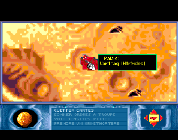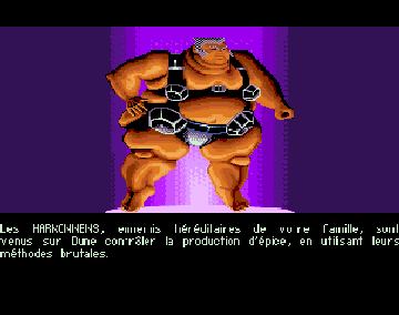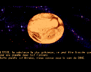 Cela dit un jeu qui comporte tout de même 105% d'images immobiles a beau être super chiadé graphiquement, il se doit d'accorder une importance toute particulière à sa musique. C'est le cas ici puisque les quelques morceaux qui nous accompagnent, aux tonalités plutôt arabisantes, sont certes vite répétitifs, mais ce n'est pas pour autant qu'on a envie de couper le son. C'est même plutôt l'inverse. Tetris, vous situez ? Ici c'est exactement pareil, c'est la musique qui t'écoute. La bande-son de Dune appartient à ce genre de musique lancinante, qui, si vous n'y prenez pas garde, se fait de plus en plus insistante, de plus en plus forte, sans que, bizarrement, vous n'ayez touché à la molette du volume. Puis, au fur et à mesure qu'elle atteint vos centres nerveux supérieurs, vous continuerez à l'entendre après avoir éteint l'Amiga, puis à longueur de temps, de jour comme de nuit ; elle vous poursuivra jusque dans les chiottes, tel un Spetsnaz russe. Comme Tetris donc. Qui est un jeu russe. Comme quoi, rien n'est laissé au hasard dans le Grand Ordonnancement du Monde qui est consigné dans ce vieux cahier écorné, planqué sous un pile d'anciens numéros de Télérama dans le placard à chaussures du Créateur. Je m'égare, il est temps de conclure.