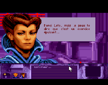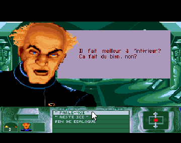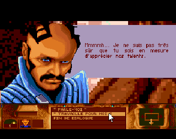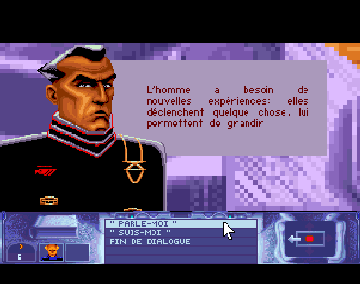 A l'époque, Cryo est un petit développeur français sans prétentions qui n'a que peu de jeux à son actif, voire un seul : Extase, sorti lui aussi sur Amiga, un jeu de réflexion avec des robots et des orgasmes. Cela suffit pour que déjà l'on sente poindre la petite étincelle caractéristique de la « french touch », synonyme, ici comme souvent ailleurs, de jeux plein d'idées, atypiques, mais aussi passionnants qu'un sermon de carême. Nous ne nous étonnerons donc pas de leur faillite en 2002, et j'espère d'ailleurs que ces zazous se sont enfin trouvés un travail sérieux, comme laveur de carreaux ou vendeur de cartes postales sur le Champ de Mars.