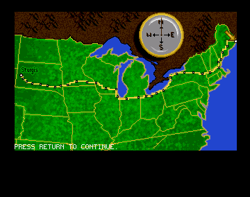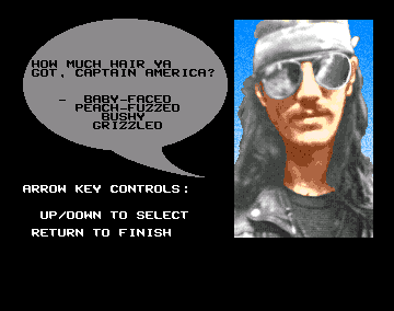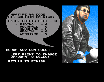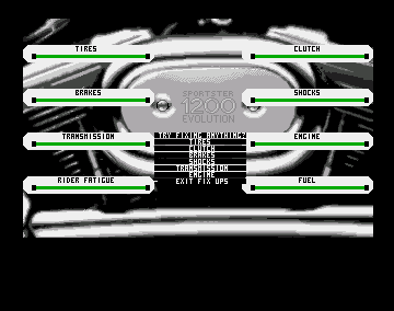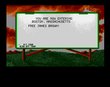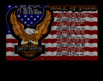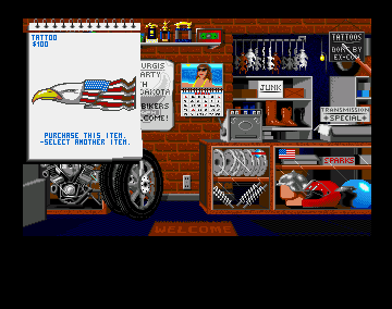 dude qu'on joue part de Eastport, Maine, et doit atteindre Sturgis en moins de dix jours, rien qu'avec sa Harley, son cuir, sa bite et son couteau (par ordre d'importance). On commence devant une station service. Déjà là on voit que le jeu a été programmé par une bande de hippies décadents : le mec est monté sur sa bécane en pantalon de survet' et baskets. Sur une Harley, quoi. Ca de mon temps, c'était un coup à recevoir une correction au pied-de-biche au resto routier. Tiens, ça me rappelle la fois où ce mec était venu nous dire qu'on faisait trop de bruit, Apocalypse Bill l'avait traîné sur quinze miles attaché à son chopper, et puis on l'avait noyé dans la mangeoire des cochons du vieux John. Enfin bref. Pour parfaire la dégaine de ce wanna-be, on peut acheter tout ce qu'il faut à la station : cuir, bottes, casque à pointes, tatouages… Attention à pas y passer trop de temps non plus, on n'est pas des gonzesses.