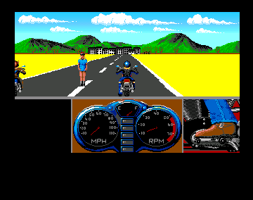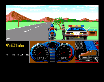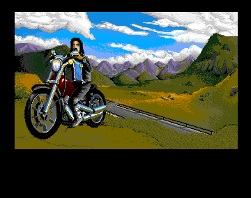 ndlr : oui, nous avons mis la main sur le seul motard expert de l'Amiga. Merci de votre compréhension). Dommage que ça soit quasiment la seule musique du jeu, ensuite c'est tellement silencieux que ça m'a rappelé cette fois où j'ai crevé au milieu du désert de Mojave.