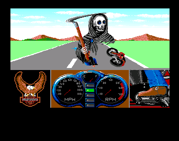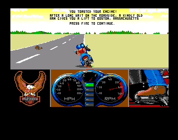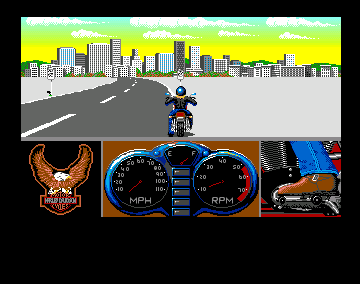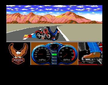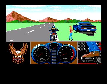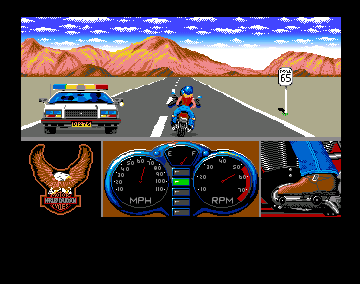 -Ben, ensuite on s'arrache. On se retrouve sur une route en vue de derrière, et il s'agit d'atteindre la ville suivante en un seul morceau. Et c'est pas gagné. Déjà il faut démarrer : avec un bouton pour accélérer, un pour ralentir et un pour changer les vitesses, il faut un petit temps avant de s'habituer aux contrôles. Dans le bas de l'écran, les différentes jauges de la Harley sont représentées (vitesse, essence, compte-tours), ainsi que le pied du motard. Ben oui, pour montrer qu'on passe les rapports ! Une fois parti, attention à ne pas dépasser les 65 miles de l'heure, sinon t'es bon pour être arrêté par le premier