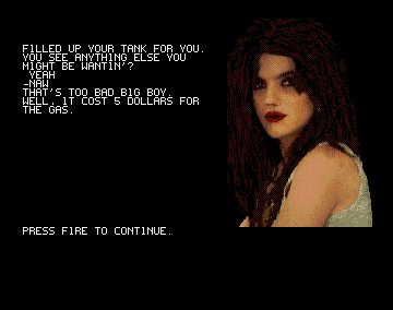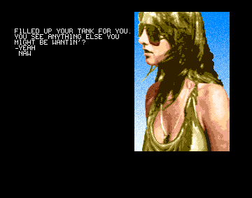 -Ouais. Au bout de dix minutes, un quart d'heure de conduite, on arrive dans un quelconque bled. Là on nous donne le choix de continuer ou de faire une pause. Si on s'arrête, on retombe devant une station-service, où on peut réparer sa moto, acheter de nouvelles pièces (moteur, freins, pneus, joints de culasse), et puis surtout faire le plein. C'est que ça bouffe ces bêtes-là, alors faut faire gaffe, d'autant plus si comme moi tu voyages avec tes économies planquées dans le réservoir. L'avantage c'est qu'ici, l'essence ne coûte que quelques cents du gallon (