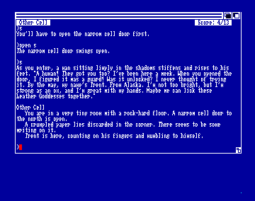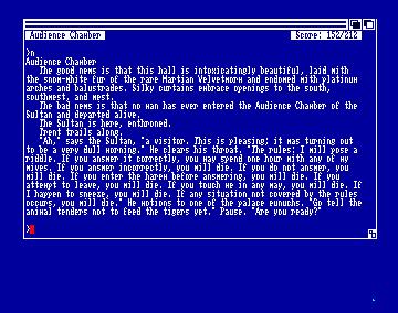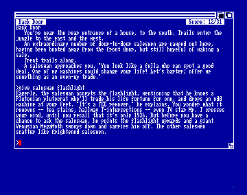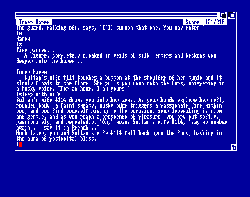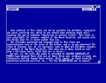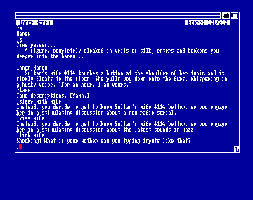 La première réaction de tout être humain normalement constitué est alors d'écrire successivement « merde », « pipi », « caca », « grosse truie », parce que bon, faut bien rigoler un peu en ce bas monde. Puis, on passe aux choses sérieuses et on essaye de trouver la bonne commande. En l'occurrence, ce sera « northeast » ou « northwest », selon que l'on veuille rejoindre les toilettes hommes ou dames. Cette décision aura d'ailleurs plus d'importance qu'il n'y paraît, puisque cela détermine le sexe de votre personnage (donc non, on ne peut pas jouer un pervers qui va reluquer dans les chiottes des filles). D'ailleurs, à ce propos, le jeu vous considère toujours comme hétérosexuel, c'est donc râpé pour les folles scènes lesbiennes qu'on avait tous imaginé en voyant le titre du jeu.