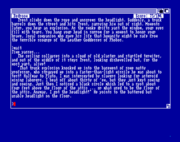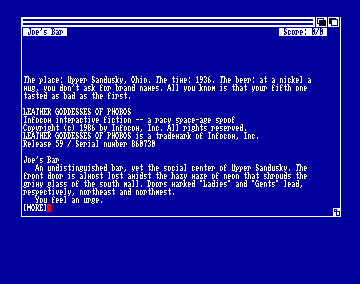 L'aventure démarre sur les chapeaux de roues : vous jouez un clampin (ou une clampine, comme nous le verrons par la suite) de l'Ohio profond qui a décidé de se mettre minable au bar du vieux Joe, parce que c'est pas tous les jours samedi soir. Après avoir éclusé un nombre déraisonnable de bières de table, vous êtes pris d'un tenaillement au bas ventre, et il devient plus qu'urgent pour vous-même, votre futal et votre réputation, de rejoindre les gogues. C'est le moment que choisit l'ordinateur pour vous laisser la main, un petit carré interrogateur clignotant doucement en bas à gauche de l'écran.