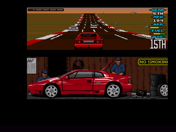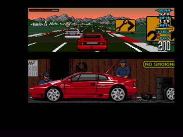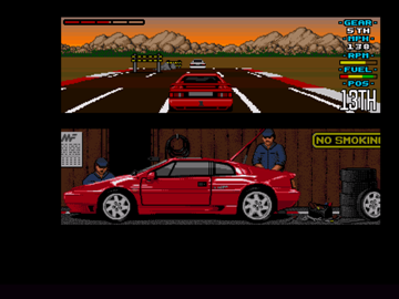 Le jeu se jouait à un ou deux joueurs. Mais même en mode un joueur, l'écran était splitté et la deuxième moitié montrait des mécanos en train de bosser sur une Lotus. Comme son nom l'indique, le jeu ne comporte qu'une seule voiture et est un hommage à cette dernière : la Lotus Esprit Turbo. Ce petit bolide (à ne pas confondre avec la Lotus Turbo Esprit) a été designé par Peter Stevens et est sorti en 1987. Typiquement années 80 par son look et surtout son absence de courbe, elle embarquait un V8 de 3.5L qui la faisait passer de 0 à 100 en 4s. Vous pourrez l'admirer sous toutes ses coutures durant l'intro. La bête vous fera même un petit clin d'œil avec ses phares. Autant vous dire que l'impression de vitesse devrait être au rendez-vous avec une caisse pareil.