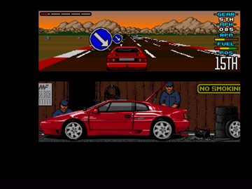 Depuis le jour où je l'ai entendue, je n'ai jamais pu oublié la musique de l'écran titre, qui nous accompagne durant les courses. Ça commence par un riff de basse génial puis on enchaine sur quelques percus et la guitare se déchaine. J'en ai encore des frissons à l'écouter aujourd'hui. C'est con à dire mais j'ai commencé par aimer ce jeu pour cette musique ! Après l'intro, on choisit la difficulté qui correspond au nombre de courses qu'on veut jouer : 7 pour le mode Easy, 10 pour le mode Medium et 15 pour le mode Hard ! Puis vient le choix entre la boîte automatique et la boîte manuelle.