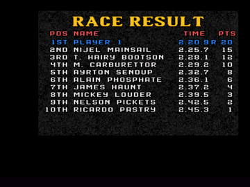 Relancer ce jeu pour ce test m'a presque arraché une larmichette. Certes, je suis toujours aussi nul mais le jeu est exactement comme dans mes souvenirs : pas spécialement beau mais bien nerveux et très rapide. J'avais oublié les excellents bruitages avec les pneus qui crissent dans les virages ! Allez je vous laisse sur une note d'humour : un écran de fin de course avec les noms des concurrents joués par le CPU. Toute ressemblance avec des pilotes de F1 ayant existé ne serait que purement fortuite.