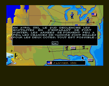 Tout d'abord il vous sera possible de choisir le niveau de l'ordi qui vous affrontera (entre 1 et 3). Ensuite vous pourrez décider si la météo se mêlera ou non à la fête, ainsi que les indiens et autres mexicains. Y'a même un débarquement qui est paramétrable. Oui, un débarquement. En pleine guerre de sécession. Clin d'œil des développeurs français j'imagine. Pour un jeu franco-français du reste. Enfin bon. Rien qui casse trois pattes à un manchot.