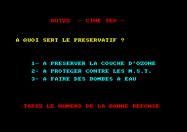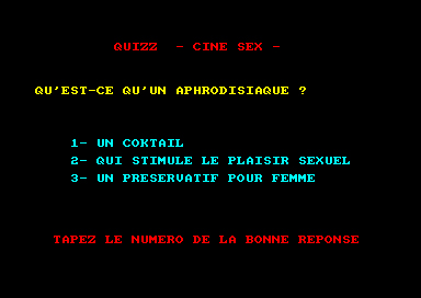 Aprodite dans la mythologie grecque était la déesse de l'amour et de la fécondité. Ceci élimine d'office la réponse 3 mais laisse planer le doute sur les deux autres choix. Pour votre gouverne, sachez qu'il est très mal de mettre à contribution l'alcool pour parvenir à des fins sexuelles, que vous soyez un homme ou une femme et un jeu Amstrad ne saurait véhiculer de telles idées. La réponse 2 est donc la bonne.