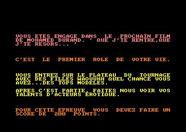 C'est un fait avéré que vos récentes expériences sexuelles avec une cul-de-jatte ne contrediront pas : La vie est faite de surprise, et mieux encore, cela vaut aussi pour ce ramassis de gros losers que sont les joueurs de jeux vidéo. En particulier nous, les oldies. Seulement vous pourrez bien avoir réussi votre vie, être un avocat renommé dans le 9ème ou avoir mis au point un remède contre le Sida et un sirop pas dégueulasse contre la toux, jamais l'occasion ne vous sera donnée de devenir la star du porno d'un jeu Amstrad. Bien mal acquis ne profite jamais et je suis là pour vous aider à orner le mur de votre salle de séjour d'un trophée qui attirera la convoitise de vos amis déjà mariés, un enfant, un chien, situation stable et tout ce genre de trucs terriblement communs.