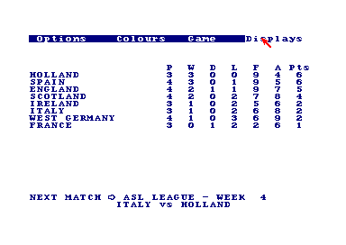 Pour en finir avec ce jeu bien trop riche pour en faire véritablement le tour en quelques lignes, rajoutez à tout ça la possibilité de participer à des coupes, des ligues ou de faire saisons complètes avec les 8 équipes disponibles dans le jeu. Vous obtenez assurément la meilleure simulation de football de l'Amstrad, tant par sa richesse que par son choix de privilégier le réalisme au côté arcade et nerveux, style popularisé au même moment par Kick Off et dont l'adaptation CPC fut un fiasco. C'est un jeu qui arrive à être encore plaisant malgré son âge (il possède d'ailleurs une petite horde de fans acharnés sur C64, ce qui est un signe de qualité) et qui mérite d'être découvert si vous étiez passé à côté.