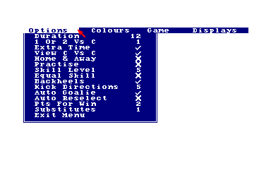 Un coup d'œil et je commence à trouver mes marques. Ce jeu est d'une richesse ahurissante. Les options vont du réglage de la durée du match au choix parmi dix niveaux de difficulté, en passant par le contrôle du gardien. Il est également possible de décider le nombre de directions que pourra emprunter les passes et les tirs (tout droit seulement, 0°-45° ou 0°-30°-60°).