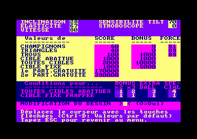 L'écran titre de tueur. Le punk bien typique de ces sombres années de 1980. La crête verte bien pétant et le regard du veau mort. Le manteau trop large taillé carré. Merveille des merveilles ! Et les bruitages. Mon dieu tous les bruitages du flipper réunis dans un seul écran ! On s'y croirait, l'Amstrad sent déjà la clope froide. Énorme. Puis l'écran des options. Moche. Mais j'en vois deux qui me fascinent toujours autant : réglages des touches et édition des niveaux. Mon dieu, mais où va-t-il chercher tout ça ? Oui, le paramétrage des touches en ces années là a quelque chose de magique, de beaucoup beaucoup trop rare. Exceptionnel. Sur nos émulateurs chéris, tout est configurable, mais souvenez-vous l'époque faste où on devait s'adapter à un jeu – un clavier. Hein ? Et bien pas ici, la grande classe !