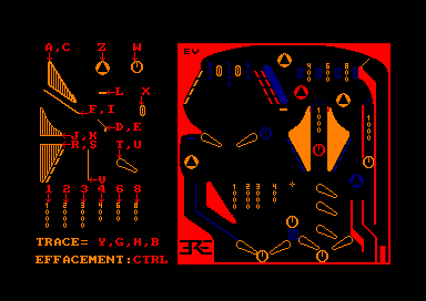 Mais l'intérêt du jeu en 1985 est tout autre. L'auteur a voulu être original et proposer un véritable éditeur de niveau. Bon, il avait oublié que la même chose existait sur Apple 2, mais là n'est pas la question. Il l'a donc fait sur Amstrad. Et le résultat est extraordinaire. En plus de la modification de l'inclinaison de la table, des scores et autres fumisteries, il y a surtout l'éditeur de la table. Créateur de renom, designer de tous bords, venez conceptualiser des tables de flipper en 4 couleurs ! On se retrouve avec une table vide que l'on peut remplir. On déplace le curseur, on appuie sur une touche, et hop un flip. Puis un autre. Un champignon, une trappe, et c'est bon. Miracle ! Vous pouvez bien sûr sauvegarder votre création sur une autre disquette, pour ne pas la perdre. Bon, j'admets que je ne me suis pas foulé pour faire la table de démonstration, j'ai appuyé partout. Mais bon l'image est là. Et après un peu de patience et de talent, quelle joie de jouer sur sa propre table. Avec la demoiselle qui continue de vous dévisager gravement.