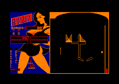 Mais on ne commence pas un jeu par l'éditeur de niveau. Hop une partie. Premier coup d'œil. Une jeune femme à l'œil particulièrement coquin me dévisage légèrement. Les couleurs sont un peu pas assez nombreuses… Doux euphémisme. 4 couleurs suffiront tout le jeu durant, mais la vie est ainsi faite, j'assume. On lance la balle en levant les deux flips. Hop c'est parti là hop hop chaud bouillant. La balle a un moteur physique qui se tient. Si si. Elle rebondit à peu près proprement, et elle ne fait de rebonds contraires à la logique. Ouf. Oui, sur Amstrad, la physique n'est pas encore totalement aboutie. Ce n'est pas le processeur de pauvre dont la bête est dotée qui va gérer la crise, loin de là. Mais tout a été pensé pour laisser un maximum de place à la « simulation ». La table est sympathique, avec ce qu'il faut pour mettre une bonne ambiance au jeu. Frais.