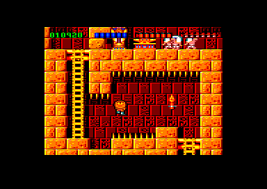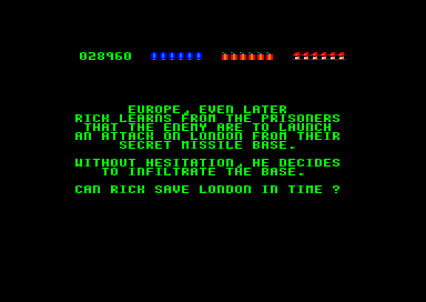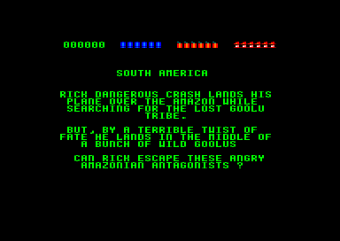 Chargement de la disquette Amstrad. Écran titre en texte. On y apprend que Rick a planté son avion dans la jungle amazonienne, mais là n'est pas le plus important, il doit surtout éviter les cannibales Goolu. Pas de bol il atterrit pile dans un repaire de cannibales. A vous de l'en sortir. En gros. On avance dans le premier tunnel, et là, c'est le drame. On est poursuivi par une boule en pierre. Si cette scène ne vous apparaît pas comme un clin d'œil à Indiana Jones, vous devez penser à consulter. Et c'est là où le parallèle est amusant. Tout le jeu fait vraiment Indiana Jones. Les pièges à la con, les serpents en carton-pâte, le héros qui traverse les régions, qui au final termine avec les nazis, tout y est. Le cliché est en place.