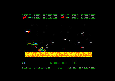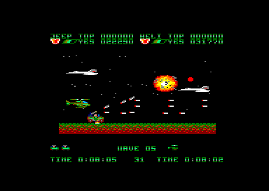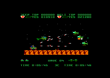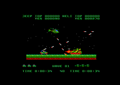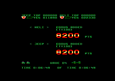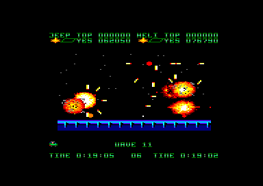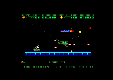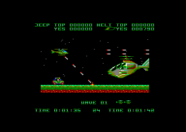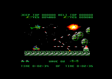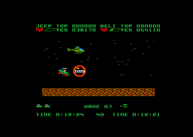 Une fois le jeu lancé, les deux joueurs doivent se partager un hélicoptère et une jeep. Ensuite, la partie commence, avec le scrolling horizontal qui va bien. Les premiers ennemis arrivent, de pauvres victimes qui serviront à étancher votre soif de destruction tout en vous familiarisant avec votre engin. Et très vite le joueur qui a choisi la jeep va se sentir floué, car beaucoup plus vulnérable que l'hélicoptère. En effet des mines parsèment le sol, et elles sont inévitables. On peut bien s'envoyer en l'air un court instant avec notre pin up sur quatre roues mais le bond n'est pas suffisant pour pouvoir survoler une mine. Encore un délire de programmeur qui se poignait rien qu'en pensant à tous ces joueurs qui espéraient se sauver la mise, et en fait s'explosaient comme des mouches sur un pare-brise.