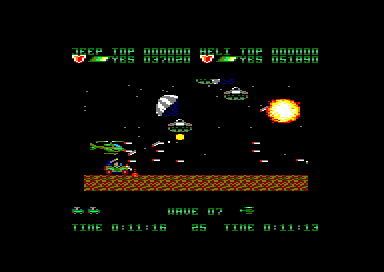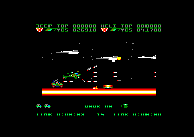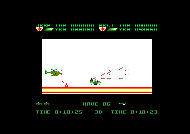 C'est ici que la notion de coopération prend toute sa place. Car pour arriver au bout des 11 niveaux (certes très courts), il vous faudra bosser à deux, en se divisant un tant soi peu les tâches (j'ai enfin pu placer du taylorisme dans une critique, cher prof d'éco si vous me lisez). Et c'est encore plus vrai à chaque fin de niveau, qui donne lieu à une véritable orgie balistique face au boss, qu'il vous faudra dégommer dans une pluie de cartouches et de missiles, jusqu'à en faire ralentir notre bon vieil Amstrad.