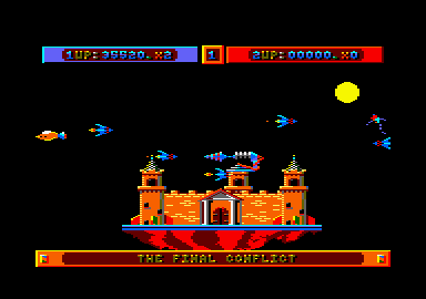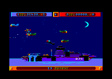 Graphiquement, c'est du mode 0 : résolution ridicule mais couleurs chatoyantes donc. Et c'est tant mieux comme ça. Seize couleurs simultanées ne sont pas de trop pour nous faire voyager sur le bleu infini des étendues du Pacifique, en louvoyant parmi des archipels dont le nom sonne comme un exercice d'orthophoniste ou une mauvaise marque de jus de fruit. Les écrans fixes sont clairs, propres et sans ambiguïté ; on sait où on est et ce que l'on doit faire. Les petits pioupiou se détachent bien dans le ciel et ne se demande que très rarement où est passé le notre, même lorsque l'espace aérien vire à la ratatouille mécanique. L'olive dans le verre à Martini : une gestion en temps réel de la course du soleil. Le CPC mouline comme un petit fou pour faire défiler les journées avec une variation de la teinte du ciel et les astres qui passent faire coucou derrière votre zinc. Une excellent façon de maintenir la pression de l'ultimatum des sept jours évoqué plus haut. Ah ça, on est pas à Stalingrad, où il fallait un mois pour avancer sa tente d'une cinquantaine de mètres dans la boue. Les russes ont toujours été horriblement besogneux.