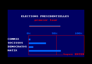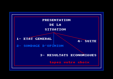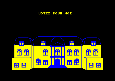 L'intro vous met tout de suite le pouvoir dans les mains : l'Elysée en trois couleurs qui s'affiche par élément et ligne et la Marseillaise en midi. Et c'est peut-être parce que cette intro a l'aspect et la dynamique de 3615 Ulla ou Nintendo sur minitel que le charme prend. En tout cas pour moi mais si vous avez atterris ici, amis oldies, vous y serez sans doute sensibles.
