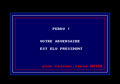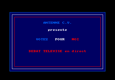 Votez pour moi est une pure bizarrerie de cette époque où les créateurs d'un jeu pouvaient être de parfaits inconnus le codant dans un garage (ce qui parait ahurissant aujourd'hui) qui avaient envie de se taper un trip sur un sujet quelconque. Et le trip ici c'est de jouer au président, de faire de la politique et de se taper des secrétaires à brushing choucroute, tailleur jupe et sourire entendu de celle qui n'attend que cela pour accéder à la gloire (je rappelle encore une fois que nous sommes en 1985). Bref, un jeu de simulation politique où vous aurez le pouvoir et dont le but est la réélection à la fin du mandat.