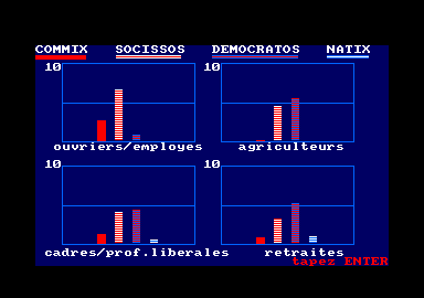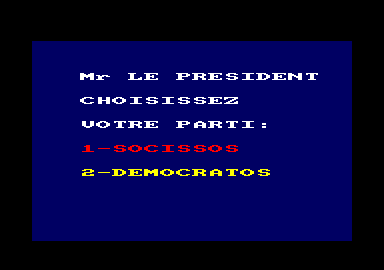 La suite justement, continue dans ce sens. Le jeu commence et, rien d'étonnant, vous devez choisir votre parti. Point de PS/rpr ici, vous aurez le choix entre social et démocrate, appelé avec un humour rappelant les Inconnus : socissos et democratos. Le niveau 2 montre aussi les extrêmes dans les sondages mais vous ne pouvez pas les choisir comme votre parti ce qui est à mon avis une lacune du jeu (même si, comme on va le voir, il est tout de même assez limité) : qui n'a jamais rêvé d'incarner le borgne ?