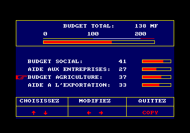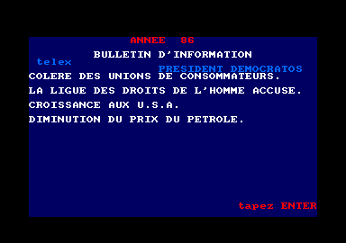 C'est parti. Vous êtes président, vous recevez donc des télex (encore un petit détail désuet à souhait, avec son petit bruitage d'époque) top secret du monde entier. À partir de ces informations, vous devrez établir vos projets politiques en fonction de différents paramètres proposés, plus ou moins variés suivant le niveau du jeu (au niveau 1 par exemple, on n'a pas accès aux sondages). Ces paramètres évoluent bien sûr au fil des années suivant les réformes et modifications de budget que vous apporterez.