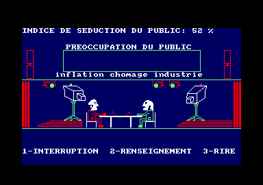 Dans ce débat, vous affronterez le chef du parti adverse dans une discussion sur les principaux points pouvant être litigieux à savoir : l'inflation, le chômage et l'industrie. Vous avez chacun votre temps de parole, vous décidez des points à aborder, vous pouvez adopter différents tons pour convaincre le public (serein, charmeur, violent). Lorsque votre adversaire parle, vous pouvez réagir en l'interrompant, en demandant des renseignements ou en riant (je vous le déconseille, le public n'apprécie pas). Et ce qui est mythique, c'est que tout est fait pour que l'on s'y croie : les caméras dessinées, un coup de marseillaise au début, la préoccupation du public, la réactivité de l'adversaire et surtout surtout, le ton des personnages. Car lorsque vous choisissez le ton du discours, le bruitage change, ridicule à souhait mais jouissif au-delà du réel. Et tellement suranné…