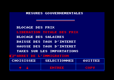 Vous pourrez également prendre de nouvelles mesures gouvernementales qui ajoutent un peu plus de subtilité même si elles ne vont pas bien loin. Amusez vous à les tester, pour info, sélectionner radicalement arrêt de l'immigration (mais pourquoi ce choix si on ne peut pas être FN ?) entraine un rappel à l'ordre sympa au prochain télex… Vous voilà prévenus.