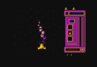 Qu'est-ce donc au fond que Goldrunner ? Un shoot-them up vertical. Ah. Sur un scénario accessoire, nous allons donc devoir encore et toujours tout péter. Eh bien vous ne croyez pas si bien dire. L'objectif de Goldrunner n'est pas de suivre un scrolling imposé en pulvérisant des vagues d'aliens jusqu'à un boss final, pas du tout même. Dans Goldrunner, il faut péter le décor. Si si. Des vaisseaux viendront vous emmerder bien sûr mais votre objectif, c'est le décor. Ah. Donc liberté totale, panard, si vous oubliez un morceau derrière vous, le niveau est infini donc pas de souci. Youhou.