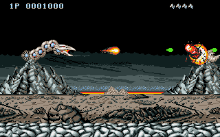 Vous suivez donc, au début du jeu, la naissance de votre dragon, que vous devrez contrôler tout au long des cinq niveaux du jeu. L'histoire est très sommaire et n'est expliquée nulle part, mais on s'en fout. Votre héros n'a pas de nom ni d'identité, vos adversaires non plus et ce n'est pas bien grave, Saint Dragon fait partie de ces jeux dans lesquels on attrape le joystick pour flinguer tout ce qui bouge, sans poser de question, tout en évitant de se faire soi-même descendre.