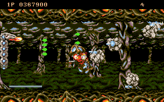 Parce que Saint Dragon est de la classe des shoot them up dits de "la boulette vicieuse". Non pas que notre robot consomme une quelconque substance illicite, mais parce qu'après la traditionnelle rangée d'ennemis qui fait office d'introduction à chaque niveau, c'est très rapidement le bordel sur l'écran. Mais vraiment. Les ennemis arrivent de partout, sont coriaces, et n'hésitent pas à décharger la purée sur vous. Il est donc très facile d'oublier la discrète présence d'une petite boulette tirée par en dessous et qui va venir heurter votre seul point faible pour vous conduire à l'explosion. La particularité du personnage central réside dans sa propre constitution. Son corps est invincible. Tous les ennemis qui s'y frotteront seront détruits, tous les tirs qui l'atteindront seront stoppés. Seule la tête, relativement petite, est vulnérable et explosera au moindre contact. On pourrait penser que ce seul point faible peut facilement être protégé, mais bien au contraire, c'est souvent le plus exposé.
