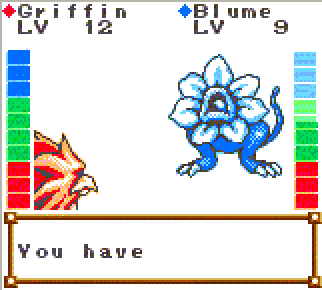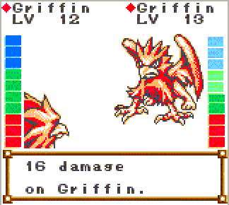 Lors des combats, petite vue à la Pokémon. Zoom, avec votre personnage en bas à gauche et le vilain en haut à droite. Les dessins des ennemis sont vraiment finement détaillés dans ce mode, c'est très beau, j'aime beaucoup. Leur couleur représente l'élément auxquels ils appartiennent. On obtient donc des plantes bleues. Mais on ne va pas chipoter pour ça non ? Ingrat ! Petit détail que personne ne verra jamais (sauf sur émulateur...), Azure Dreams a le plus beau cadre Super Game Boy de tout ce que j'ai vu. On voit un superbe dessin du ciel, du désert, de la tour et du village de Monsbaiya. Magnifique. Vraiment de beaux graphismes.