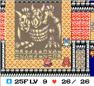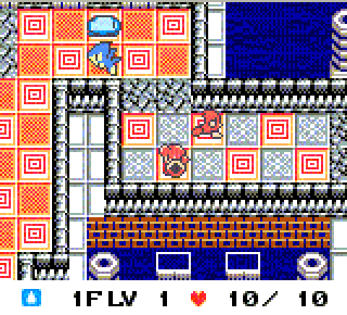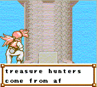 Azure Dreams est compatible avec toutes les versions de la console. Il va de soit qu'étant tout de même un jeu GB Couleur, il est plus beau sur ce support. Oui, je sais on ne sait jamais, il y a peut-être des intégristes qui préfèrent le noir & blanc à la couleur mais je ne suis pas de ceux là. Là comme ça à brûle pourpoint, Azure Dreams a tout ce qu'il faut pour ressembler au RPG lambda : une bonne vue du dessus avec un tout petit personnage, qui ne vont pas sans rappeler un bon gros Final Fantasy ou un non moins gros Dragon Warrior. Bien sûr les décors sont plus évolués que sur NES. Ils sont même bigrement mignons. Le village ressemble à un village et la vie habite vraiment le lieu. Ce n'est pas un pavé de blocs de maisons... En marchant à côté de certains personnages, on a une sorte d'arrêt sur image le montrant dans son intégralité. Genre : vous partez gaiement parler au forgeron et hop, gros zoom, un dessin magnifique qui nous montre son travail. Superbe. Les graphismes de la tour sont moins évolués. Moins de détails, et une pattern de sol vraiment trop petite pour éviter l'effet de répétition. Dommage. Les ennemis sont tout petits, mais aussi incroyable que cela puisse paraitre, ils sont facilement identifiables. Oui, ce bloc de pixels représentent un monstre précis. C'est vrai c'est incroyable. Je suis un dieu, ou peut-être que le Martini me donne un don d'ubiquité. J'y réfléchirai demain.