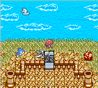 Concernant l'ambiance d'Azure Dreams, je me tatouille. En fait j'ai beaucoup pratiqué (même terminé, disons le...) la version PS. Et j'en suis grandement influencé. Oui, je sais je suis un misérable pourceau qui ira crever dans les geôles de l'enfer, d'accord. Mais quand même... L'histoire est un grand classique. Le père du héros était un gros monstre, Tamer. Mais un jour qu'il cueillait des champignons, il disparut dans la tour des monstruosités. Oui, je traduis pour nos amis francophones anglophobes. Notre petit héros vient d'avoir sa puberté et ses 16 ans, et il est donc l'heure pour lui de faire un petit voyage pour aller chopper la dépouille de son papa mort depuis 16 ans. Ou tout du moins ramener les clés de la poubelle, bloquée depuis maintenant trop longtemps. Et on doit vaincre la tour. Voilà. Classique, sobre, élégant, distingué, net sans bavure. On retrouve un bon paquet des persos de la PS, comme la créature de rêve-soeur du héros, ou le marchand Fur, ou encore Nico... Mais les personnalités sont altérées, du fait du support. On a moins de bla bla, on rentre moins dans l'histoire. C'est dommage. mais je pense que ce problème n'apparaît pas si on a pas joué à la PS. Gosh a un rôle un peu plus actif que sur PS, et fait la nouille avec son pote au nom de canard : Quack. Mais en fait non, ils n'ajoutent rien... De même on ne donne plus des rendez-vous aux jeunes filles dans ce jeu, ce qui était tout de même jouissif, et plus si affinité... La première partie du jeu copie exactement la version PS, puis dévie complètement sur la deuxième partie, et complète même la version PS. Mais globalement, l'ambiance est un peu en retrait, car le village ne vit pas complètement, tous les petits éléments du bled PS ne sont pas là... mais comment j'ose comparer l'ambiance d'un jeu PS de celle d'un jeu GB... Je suis un misérable...