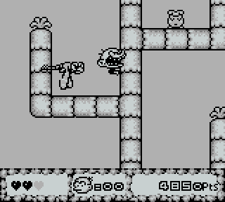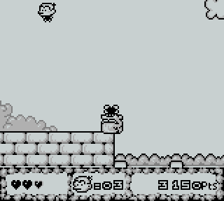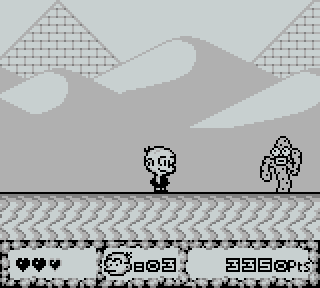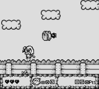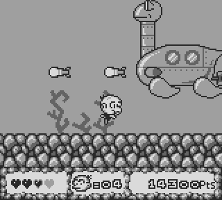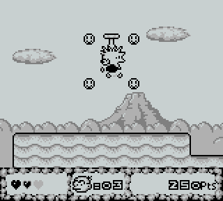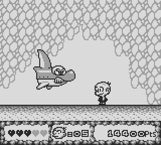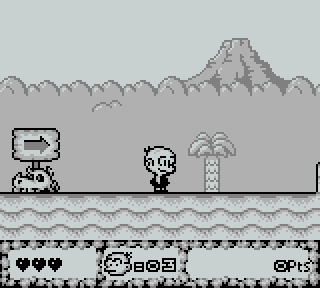 Lundi 17 Mai, 5000 mètres d'altitude, quelque part entre le Cantal et le Lot-et-Garonne. Pour tromper mon ennui et oublier le fait que je voyage à bord d'un avion en plastique, marinant dans les scories de la gueule de bois du week-end, je me tourne vers [NES Pas ?] et ses bonheurs de pixels. Pouf pouf, que va-t-on puiser dans la musette à cartouches aujourd'hui ? Allez hop, ça sera toi, oui là, petit jeu Game Boy que j'ai arraché à de mornes brocanteurs d'un dimanche bordelais pluvieux. Hop, B.C. Kid, dont j'ignorais l'existence jusqu'à le trouver coincé entre un service à liqueur en grès orange et un vinyl de Jean Ferra.