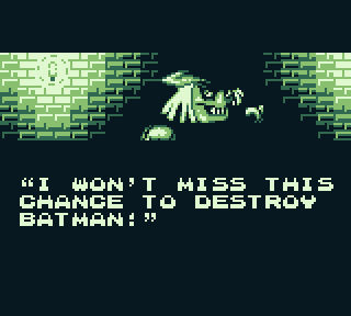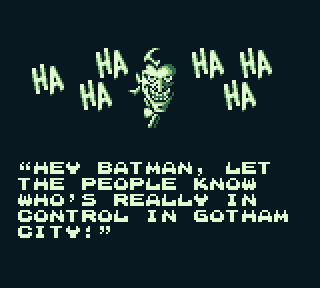 Le premier niveau commence sur les bases installées par l'intro du jeu, avec quelques petits écrans fixes en guise de scénario. Cet infâme Joker est encore en train de préparer un canular morbide pour les bons habitants de Gotham City ! Et en bon méchant mégalo, il avertit Batman de son plan génial, parce que sinon, ce ne serait pas du jeu. Un peu comme ces méchants de sous-James Bond qui laissent le héros seul sur un dispositif complexe qui l'éliminera certainement au lieu de lui tirer une balle dans la tête. Car un méchant digne de ce nom doit savoir faire preuve de savoir-vivre (ou dans ce cas, de savoir-zigouiller).