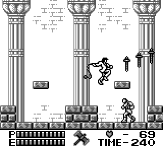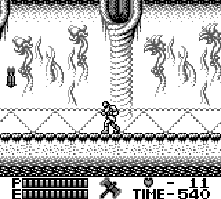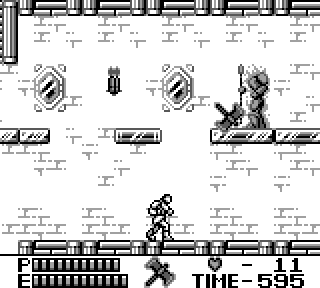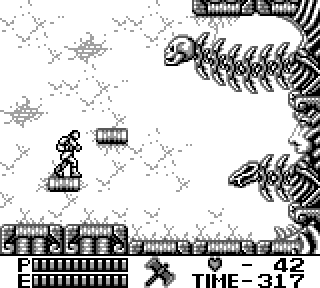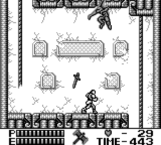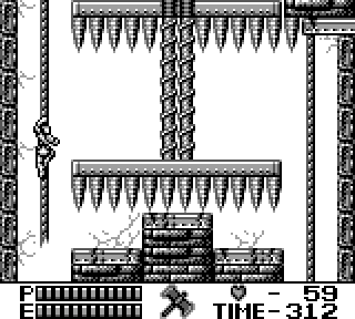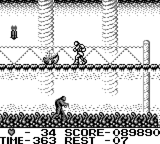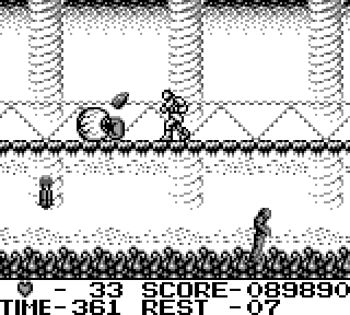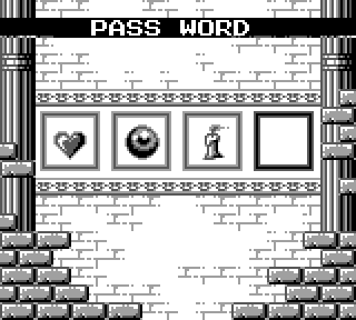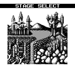 Au niveau de l'organisation du jeu maintenant, on a le choix entre 4 niveaux que l'on fait dans l'ordre qu'on veut, youpi les petits oiseaux, après quoi on a deux niveaux. Donc 6 niveaux en tout. N'oublions pas que nous sommes sur une console portable, hein. Et sans sauvegardes. Par contre il y a un système de passwords, bien utile, et assez con, au point que la première fois que j'ai essayé un code au hasard j'ai trouvé celui pour accéder au niveau 6.