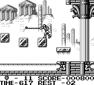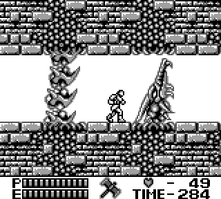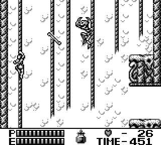 Castlevania 2 est la suite du 1, jusqu'ici, tout va bien. On joue toujours Christopher, qui cette fois-ci doit sauver son fils, Soleyiu - dont le nom grotesque l'a toujours préservé, jusqu'alors, d'une carrière solo- des griffes de Dracula, lequel commence donc à taquiner le tendron. On a le même sprite, à peu près, que pour le premier épisode. Mais question maniabilité, c'est BIEN meilleur. On va plus vite, on fait toujours les mêmes sauts de merde mais ça réagit plus promptement, on peut glisser le long des cordes, fouetter depuis une corde, le pied.