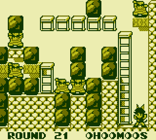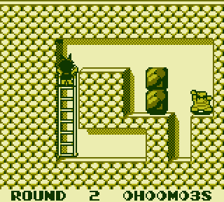C'est donc fort simple : votre héros à grandes oreilles doit nettoyer chaque tableau de personnages résultant du croisement entre un bagnard sumo et une momie de rugbyman. Faites un effort d'imagination, bon sang... Pour les éliminer, rien de plus simple : foncez-leur dessus par le côté, ils sont statiques et innofensifs. La difficulté - et il y en a une, et sacrée même - ne viendra pas de là. D'échelles en ponts, de blocs à pousser en murs à grignoter, le problème viendra du fait que votre personnage ne sait que se déplacer sur le sol ou sur des échelles, mais ne peut ni sauter ni se hisser. Il va donc falloir vous frayer un chemin en comblant les trous jusqu'à votre objectif sans jamais tomber dedans. Évidemment, au premier niveau, on a un trou, un rocher, on pousse le rocher dans le trou, et voilà. Ajoutez une petite fonction de rewind à la Braid pour vous aider en cas de boulette et c'est torché. Et toujours aussi évidemment, les tableaux suivants vont tordre le système jusqu'à vous rendre fou SUR CENT CINQUANTE NIVEAUX.