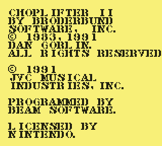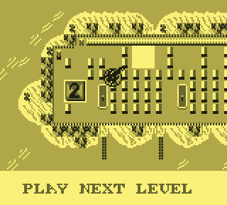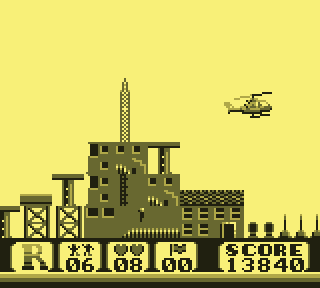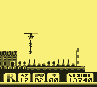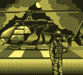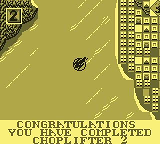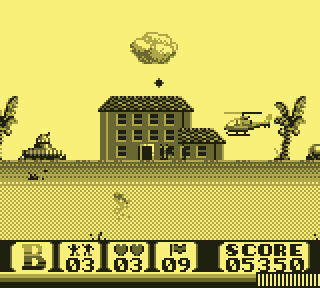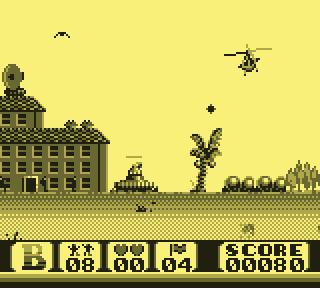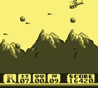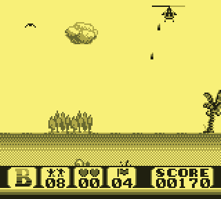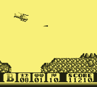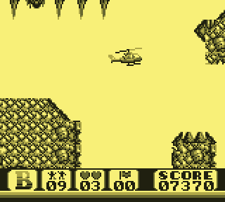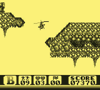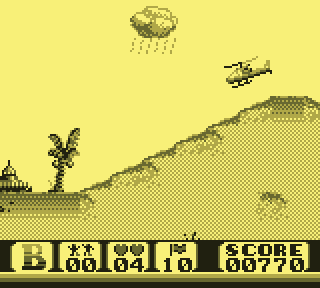 Regardez d'abord votre fier destrier des airs. Elégant, racé, monstre de technologie, il vous permet de... de voler. C'est déjà pas mal. Pour le petit merdeux de base pour qui "voler" ne se traduit que par "emprunter de façon illimitée la mobylette du monsieur", c'est un peu de rêve qui lui coule entre les doigts. Lorsque le Game Boy s'élance, votre monture s'élève lentement, pales fouettant l'air moite à toute berzingue, c'est beau, on dirait l'introduction d'un Star Wars.