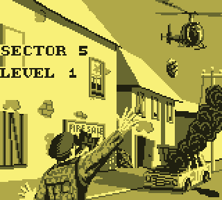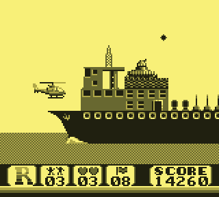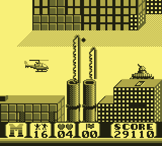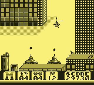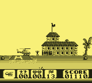 On pilote donc un hélicoptère. Ou du moins, on le déplace, en 2D, on est sur Game Boy quand même, ha ha ha jeune sot... Avant, arrière, ou plus exactement gauche, droite, super. Une courte pression sur la croix permettra de le faire pivoter. Il existe donc trois positions : orienté à gauche, orienté à droite, et orienté face au joueur. Tant de possibilités, mon Dieu, je n'en demandais pas tant, c'est grisant.