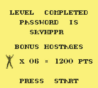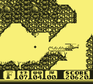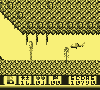 Et quand on a des couilles comme des melons, on est un as du manche. Mais ne me regardez pas comme ça, espèce d'ahuri. Je parle de compétences de pilotage. Certains passages sont du plus pur style "le pixel près". Le concept de masque de collision va prendre tout son sens, surtout quand les Anglais débarquent, et qu'on est obligé de passer par derrière, vous savez, par ce tunnel tout sombre qui ne sent pas très bon. Et un tunnel étroit dans lequel des geyser manquent de vous plaquer sur les stalactites du plafond tandis qu'un canon de DCA vous pilonne méthodiquement, on a beau dire, c'est un rien stressant. Il faudra donc de sacrées burnes pour venir à bout des niveaux 4 et 5. Choplifter fait partie de ces jeux qui, pour un pixel mal apprécié, vous donnent envie de fracasser l'écran de votre Game Boy à coups de front.
